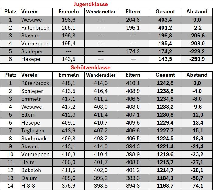Jeder Verein kann dabei so viele Schützinnen und Schützen stellen, wie er zur Verfügung hat. Am Ende werden die vier besten Schützen der jeweiligen Klasse (Jugend- und Schützenklasse) gewertet. Diese Ergebnisse ergeben dann die Mannschaftswertung. In der Schützenklasse können somit maximal 436,0 Ringe und in der Jugendklasse 218,0 Ringe erreicht werden.